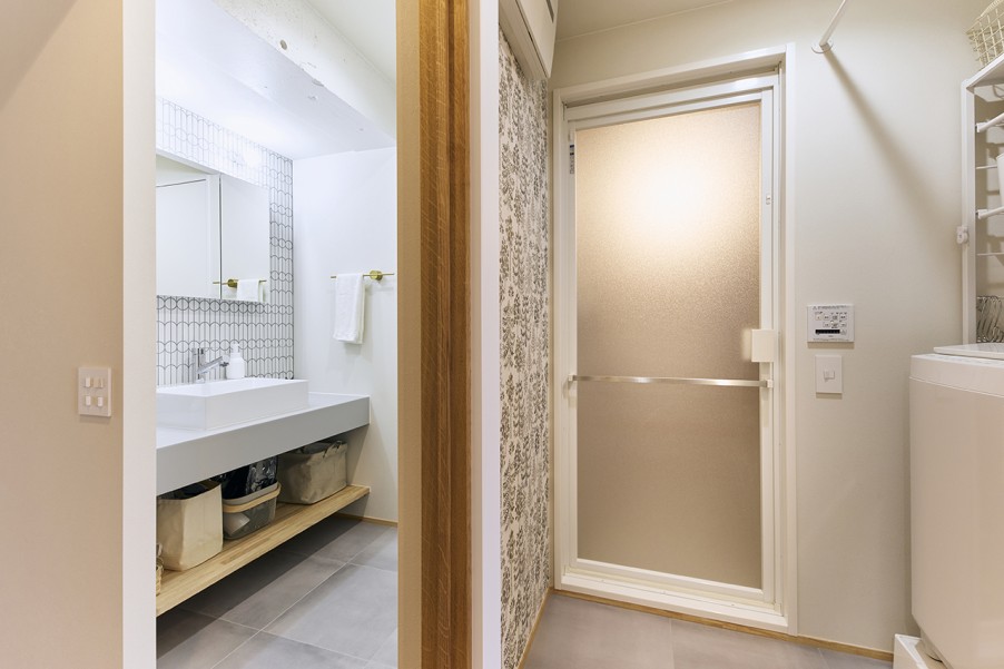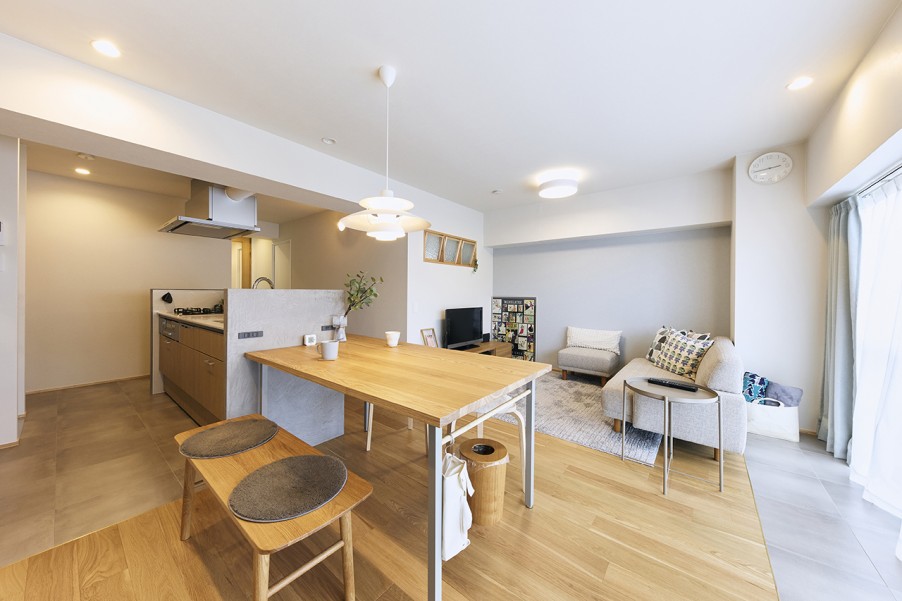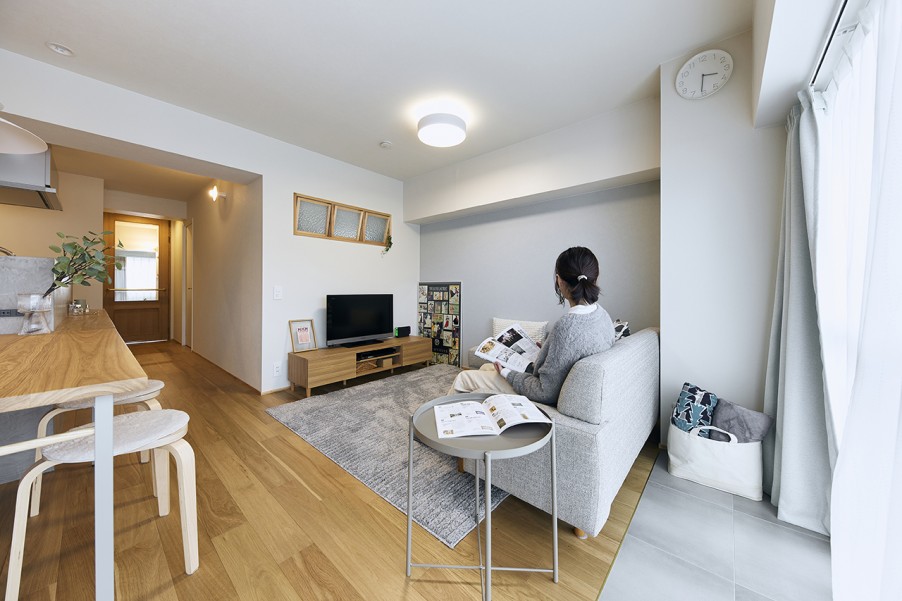 「住み慣れていますし、都会と田舎の塩梅がちょうどいいんですよね。マンションの管理状態も良く、住人の方々も綺麗に住んでいることがわかりました。もう一件内見した物件は、築年数は同じでしたが古く感じてしまって、比較したことで管理体制の良さが大切なんだと改めて実感しました。」(K様) - 2木のぬくもりを感じる北欧テイストの内装に前のお住まいでは、ランドリールームとクローゼットが離れていることや、収納量が足りないことに悩んでいたというK様。リノベーションでは、洗濯物を洗って・干して・収納する洗濯動線の良さや、収納量の確保に重点を置いて間取りを設計しました。玄関やホール、寝室とつながる約4帖のウォークインクローゼットをつくったことで、生活しやすく家事もスムーズに行えるようになりました。