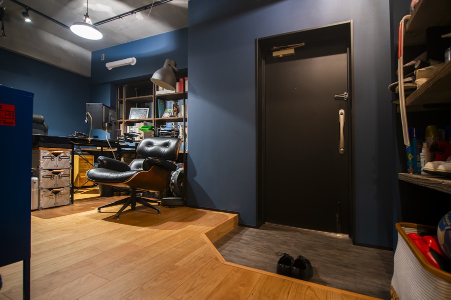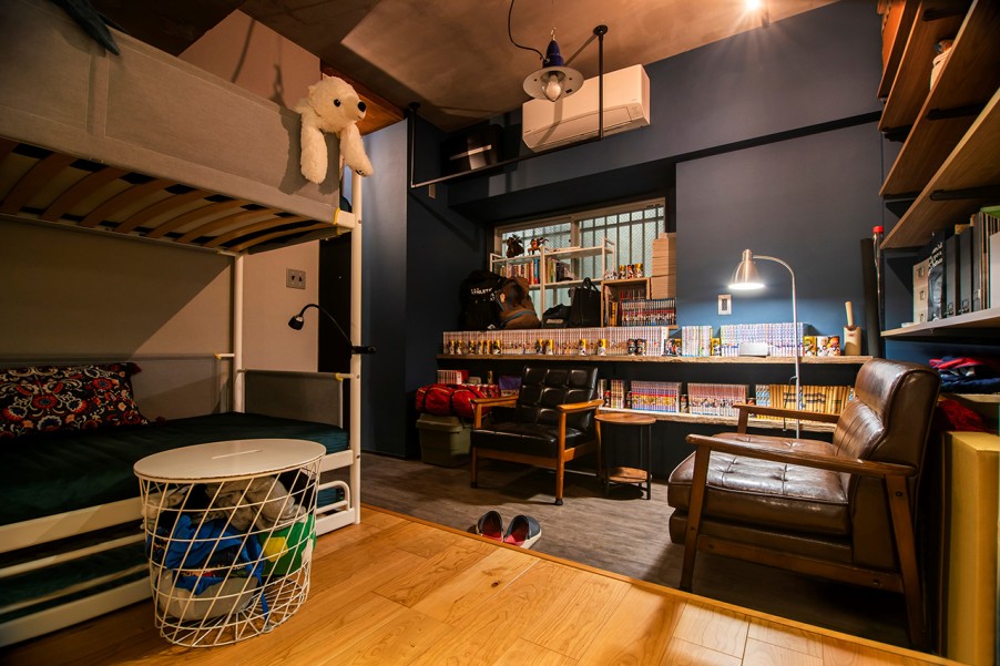 玄関を入って左には、ガレージのような隠れ家スペースにしたかったという土間(約3.6帖)があります。土間にソファを置いたことで、遊びに来た奥様のご友人が靴を履いたまま座って気軽に長話できる場所、カウンターに置いた漫画を読みながらくつろげる場所として使えるスペースとなりました。土間からは、家族5人の寝室につながります。