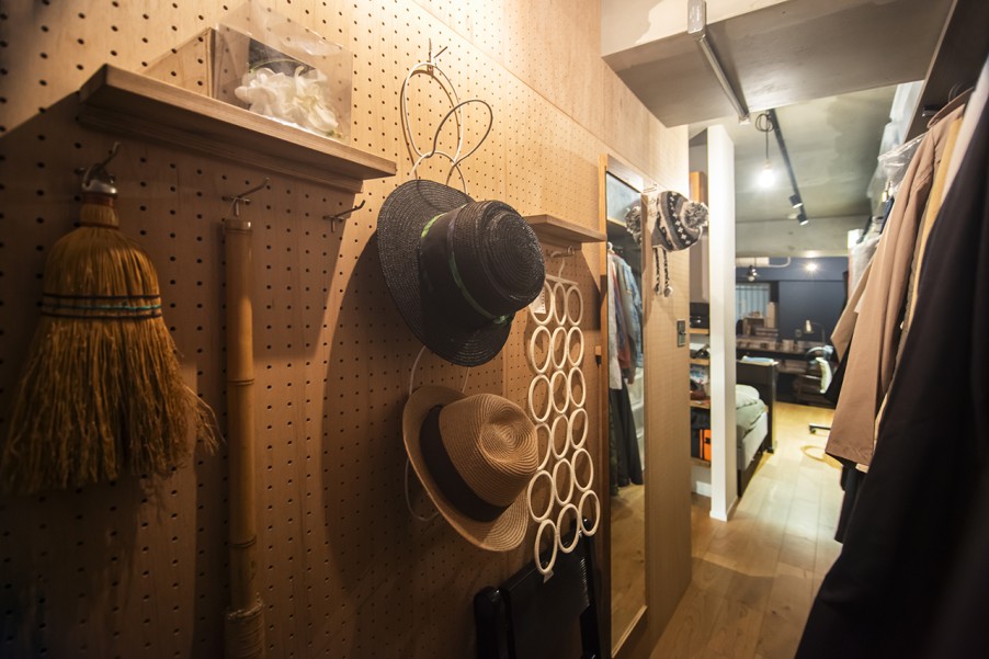 リビングのテレビボードは、テレビのケーブルを隠せるように設計したのがこだわりポイント。裏側には有孔ボードを採用し、帽子やバッグなどの小物を吊り下げておくことができます。テレビボード裏は収納スペースになっており、寝室(約8.4帖)にかけてハンガーパイプを設置し、デスクとして使えるカウンターを造作しました。