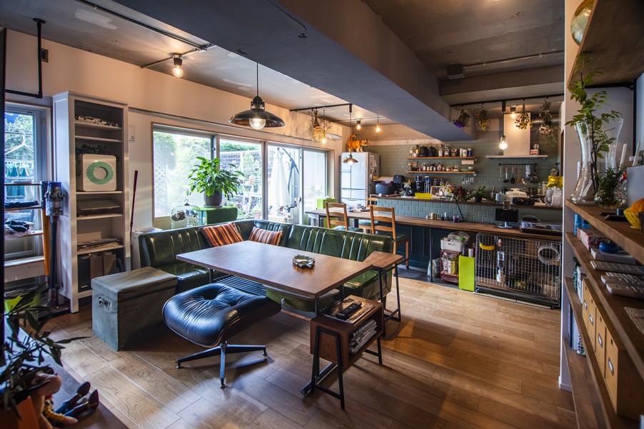リビングでひときわ目を引くのは、インテリアショップで座った瞬間に一目惚れしたというダークグリーンのソファ。リノベーションする前に買っておいたそうで、柔らかすぎず硬すぎない座り心地で、革のツヤ感が空間のかっこよさをより一層引き立てます。