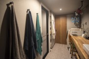 玄関を入って右には、仕事部屋として使用できるスタジオ(約5.7帖)があります。仕事道具をまとめて置くことができ、スタジオからは洗面室につながります。洗面室は、家族で並んで朝の支度ができる幅広い洗面台とスペースを確保しました。最近は、お子さんたちが座って美容男子として時間をかけているそう。
