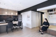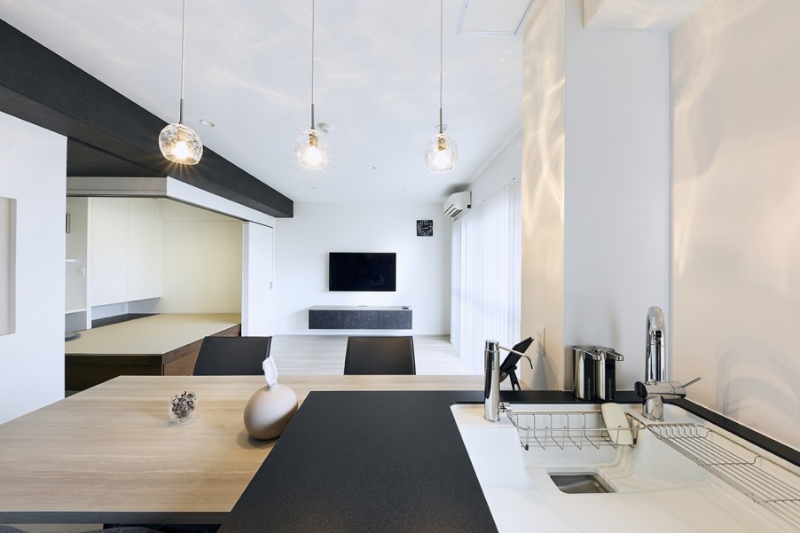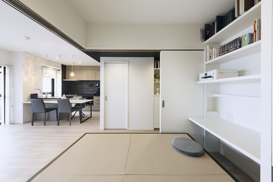 「玄関のミラーは、娘と一緒に使っています。着替えて出入りしたり、最後にベンチに座って靴を履いたりと、ファッションショーができる空間をイメージしています。ベンチはリビングのTVボードと同じデザインで造作してもらいました。小上がりの和室は、主人と息子が帰ってきたときのホテル部屋や、娘の友人が泊まりに来たときのゲストルームとしても使っています。主人のワークスペースとして使えるデスクカウンターも設置して、畳の下の収納には雛人形や賞状、トロフィーを、押し入れには客用の布団を収納しています。キッチンは、料理や洗い物をしながらダイニングテーブルにいる人と会話ができるので、便利で気に入っています。」(M様)