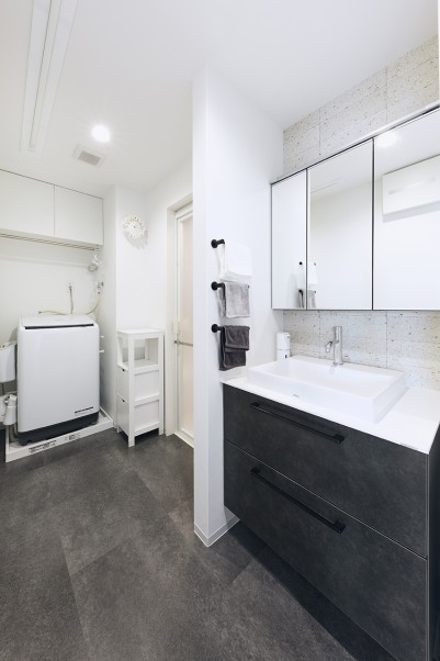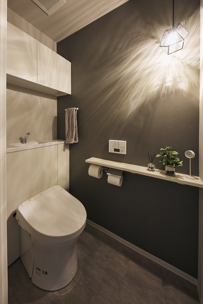 浴室には床洗浄機能を取り入れ、掃除のしやすさにこだわっています。洗面台はお気に入りのホテルを参考に、白い天板と洗面ボウル、グレーのタイルでデザインしました。トイレにはペーパー収納に便利な吊戸棚と造作カウンターを設置しています。 - 3インテリアや趣味の時間が楽しみに