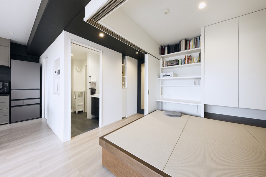 間取りは、リビングと洗面室を回遊できる既存のレイアウトを活かし、ウォークインクローゼットを新設して収納スペースをたっぷり確保しました。玄関にあるミラーの裏や造作ベンチの下、リビングと隣接する小上がりの畳の下も収納スペースとして活用しています。小上がりの和室は、配置や広さ、高さ、カウンターの設計など、何度も打ち合わせを重ねました。