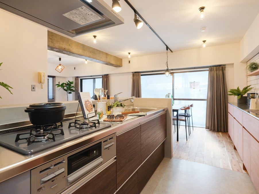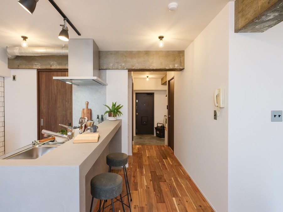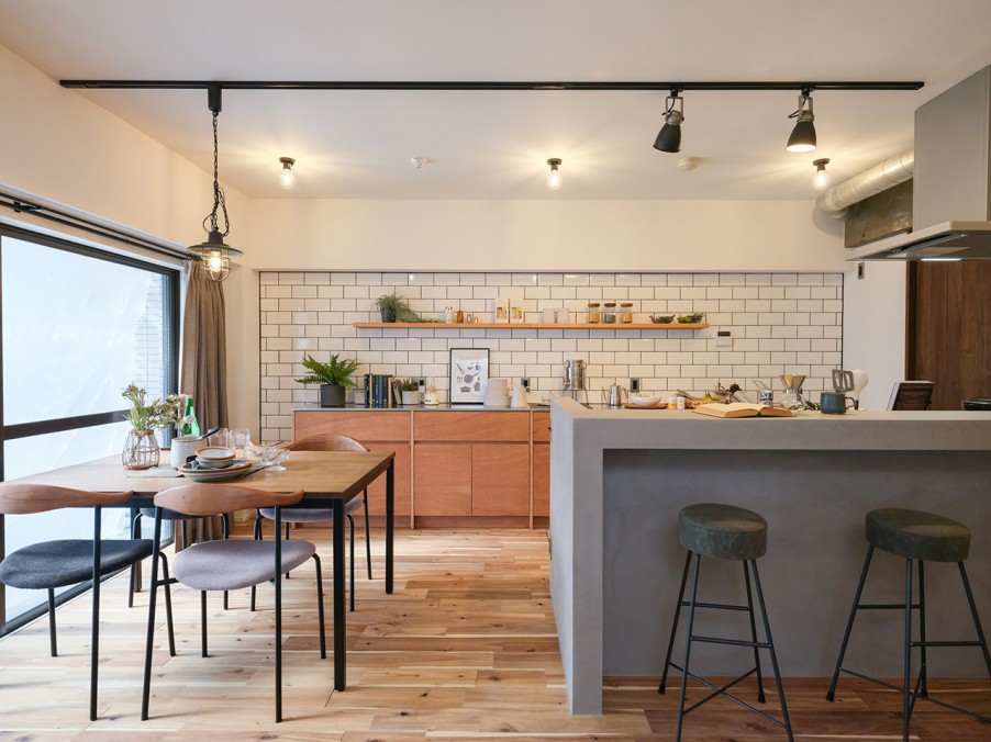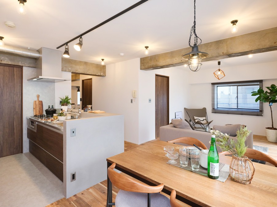 躯体現しの梁やキッチンのモールテックス、タイル、レトロな照明器具がアクセントとなり、個性的で温かみのある雰囲気を演出しています。