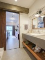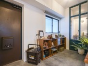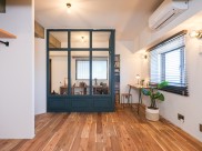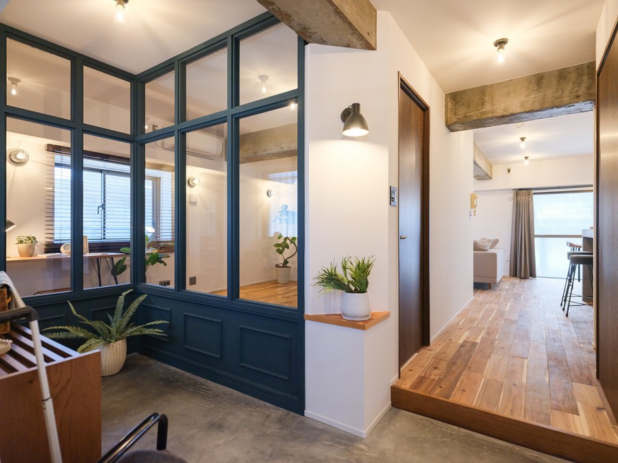 玄関に設けた土間は、自転車やサーフボード、靴などのコレクションをディスプレイしたり、DIYを楽しんだりするスペースとして活用できます。玄関と洋室の間に大きなガラスの室内窓を造作したことで、南側のリビングと東側の洋室に入る光を最大限に取り入れて明るさを確保しました。
