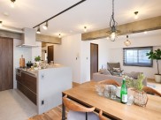約20.4帖のLDKには、無垢材の床や塗装壁を採用し、素材の質感や経年変化を楽しめる空間に仕上げています。
