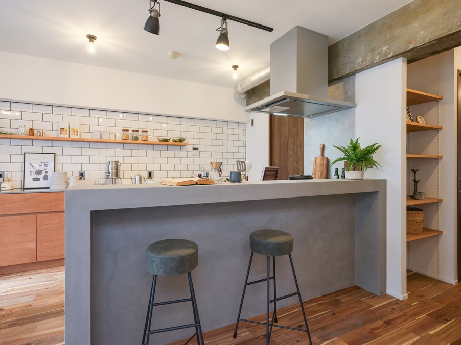 玄関からはモールテックス素材のキッチンカウンターが見え、リビングへ向かう際のワクワク感を引き立てます。また、収納スペースにも扉を設けず、趣味のコレクションを自由に見せられるように設計しています。