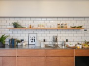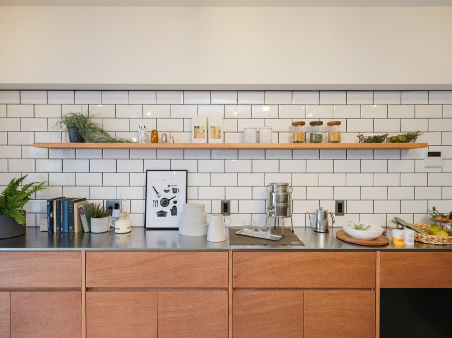 キッチンには、収納量たっぷりのカップボードを造作しました。扉は手作り感のあるラワン合板を使用し、天板はバイブレーション仕上げのステンレスです。上部のウォールシェルフには、お気に入りの食器や調味料を飾ることができます。