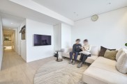 「物件購入後に希望通りのリノベーションができなかったら嫌だなと思って問い合わせたところ、担当の設計士が一緒に内見に同行してくれました。具体的なテイストはまだ決まっていませんでしたが、『何ができて、何ができないのか』を見てくださって、『この壁は壊せますか?』『キッチンはこういう形にできますか?』といった希望についても確認してくれました。『お願いするかどうかはご自由に』というスタンスも相談しやすく、他社とも比較した結果、安心感やスピード感が決め手となり、マイリノにお願いすることにしました。」(Kさま) - 2シンプルで落ち着いた空間に