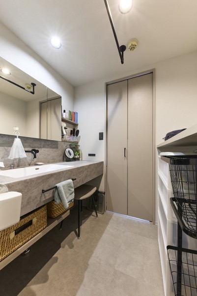 洗面室は奥さまのこだわりが光る設計です。洗面化粧台は、Instagramで見た画像を参考に奥さま自ら手描きした図案をもとに造作。「前の家は半分ほどのサイズしかなかったので、メイクスペースは絶対欲しいと思っていました」と奥さま。洗面室からはウォークインクローゼット、リビングへと一直線につながります。洗面室とリビングに洗濯物を干せるアイアンバーを取り付けたことで洗濯動線も良くなり、家事がぐんと楽になりました。