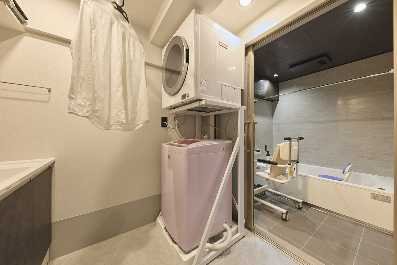 「ヘルパーさんには力仕事が得意な方もいれば、料理が得意な方もいます。どんな方でも介護ができる環境を整えることが、自分の生活を支えることにつながると思いました。例えば、腕力が足りない方にはリフトを、洗濯物を干すのが苦手な方には乾燥機を導入しました。要所要所に十分な広さがあるだけで、介護のしやすさは大きく変わります。以前住んでいた家のユニットバスやトイレは狭くて不便さを感じていたので、そこは必ず改善したいと考えていました。」(Tさま)