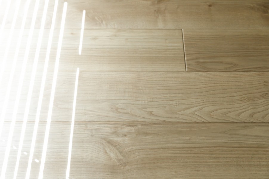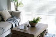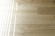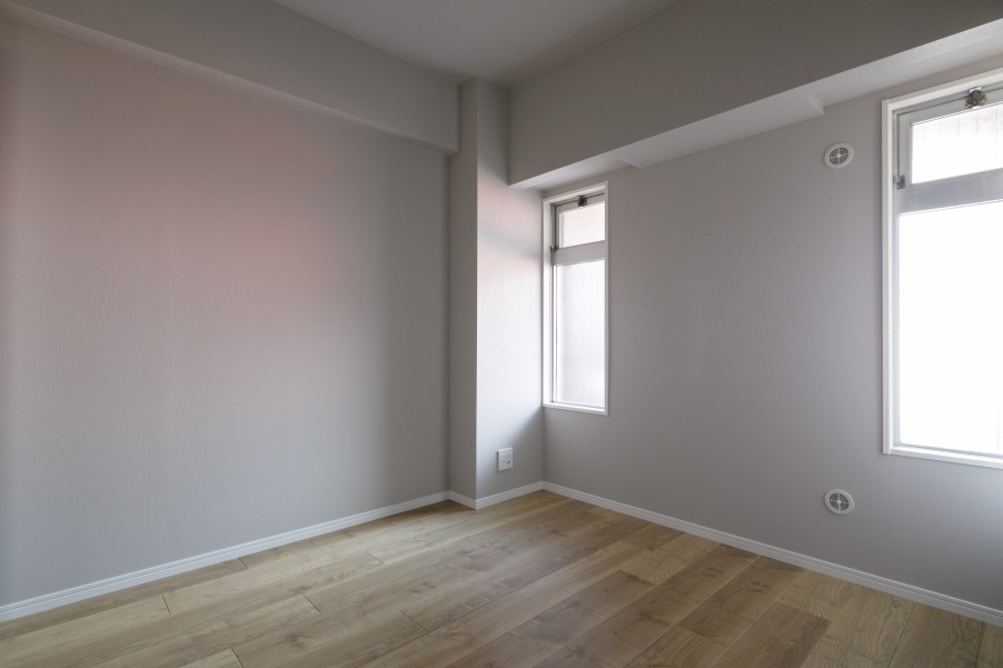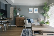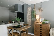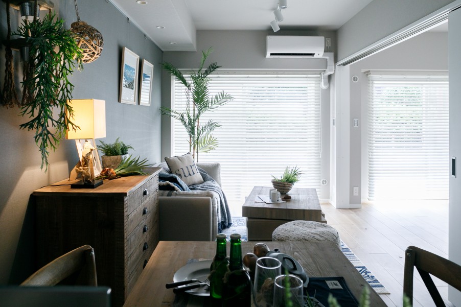 青みのグレーの壁は木彫りのナチュラルな家具を一層引き立ててます。 - 2幅広の木の床もいい味世田谷区のイメージに合うようにラフになりすぎずに、幅広のナチュラル色のフローリングを使うことで上品な部屋にしています。