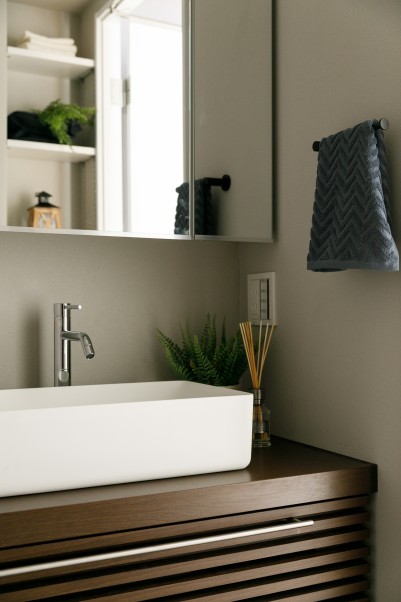 洗面室のちょっとしたスペースを利用してリネン庫をつくり収納も考えてます。