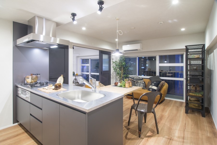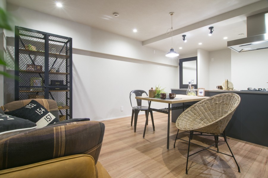 - 1昼でも夜でも、心地いい光の漏れる空間ビンテージテイストのブラックドアとメープル柄フローリングをベースに。昼でも夜でも居心地のよい空間を考えました。