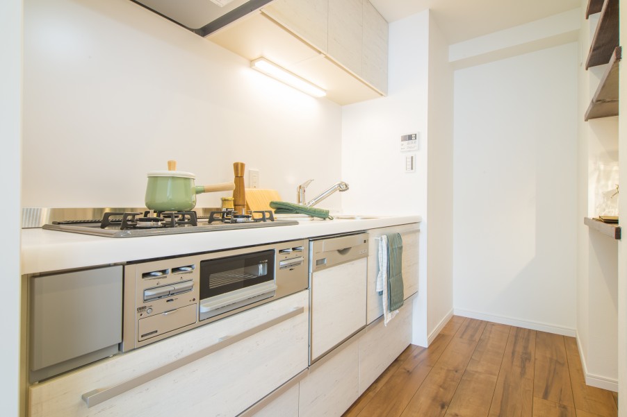 - 2リビングとつながった白色の独立キッチンキッチンスペースは、独立で。TV置き場のすぐ隣なので、TVを見ながらお料理もできるお部屋になっています。
