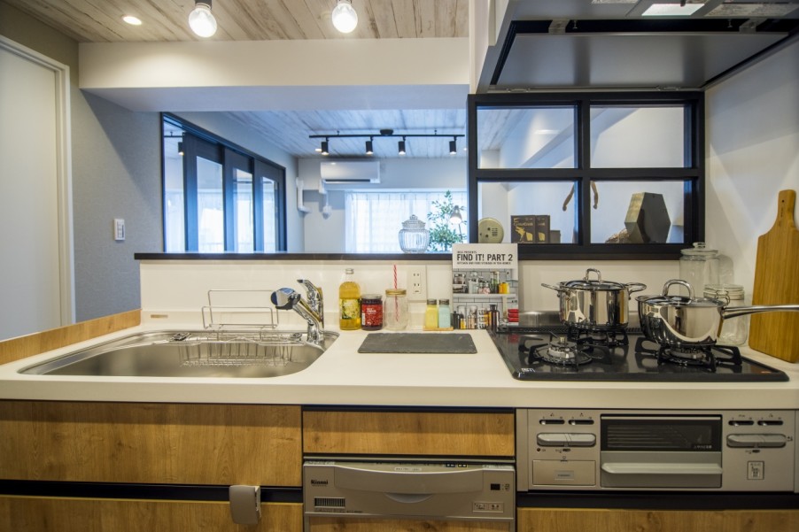 - 2寝室とキッチンの小窓がおそろいでかわいいおそろいの室内窓やガラスの建具があることで、キッチンや洋室の空間を“小さなおうち"の集まりと見立て、室内に居ながらもリビングが路地にあるカフェのように集える場所になる様イメージしました。