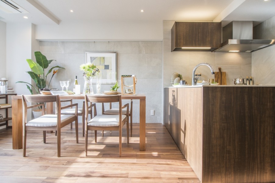 床暖房やミストサウナであったかく心地よい居場所になります。 - 3素材にこだわるダイニングは壁一面のタイル貼りで少し落ち着いた空間に、