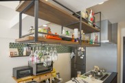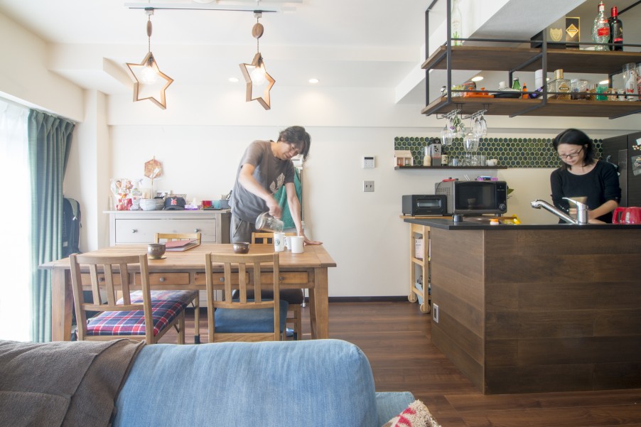 「最初に見に行った物件は駅から近くて、「すごいいい場所にあるのに、この値段?」という印象でした。ただ、私たちのイメージとは少し違っていたので、もう少し探してもらうことにしたんです。そして、何軒か見るうちに、予算内で収まるのなら、まず物件だけ探していただいて、そこを好きにリノベーション出来る方がいいね…という話になって、見つけてもらったのが、この家だったんです」(夫)すでにリノベーションされたものではなく、希望通りの部屋に作りかえる「マイリノ」を選択いただきました。物件探しの条件は会社から近いこと。夜中でも終電を気にせず、三軒茶屋に自転車で行けるくらいの距離とのことでした。自由が丘や目黒区中根の物件もご検討いただきましたが、決定までには至らず、今回の池の上の物件がまさに条件にピッタリで、すぐに決められたのだそうです。 - 2ここにこだわりましたリノベーションした家の中でお気に入りはどこかとお聞きすると「キッチンです。区切りがないので、テレビ見ながら、洗い物や料理ができます。前の賃貸は独立キッチンだったので、疎外感がすごかったんです(笑) お友だちが遊びに来ていても、みんなは部屋でワイワイ盛り上がっているのに、私は1人でキッチン。でも、今はしゃべりながら準備ができますから、本当に楽しいです。夫婦ともにお酒が好きなので、飲みながら、おつまみを作りながら、一緒に時間が共有できて大満足です」(妻)さらに「営業さんから薦めていただいたアイアンラックも良かったですよ」(夫)。お店のようにグラスを収納できるアイアンラック。営業の提案を取り入れてくださったのだが、活躍しているようです。