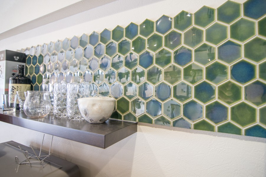 木をふんだんに取り入れたお部屋は、遊びに来るお友だちから「森感がすごいね」と言われるのだそうです。「カーテンの色やラグマットも影響していると思うのですが、ログハウスっぽいね。と言われました。でも、この方が落ち着くんですよ。僕が50代という年齢のせいもあるかもしれませんが、若い頃はメタリックなモノの方が好きでしたからね。妻はまだ30代ですが、すごく趣味が合うんです。だから、家具や照明器具なども意見が一致して、すぐに決まりました。キッチンに貼ったタイルは彼女のお母さんが遊びに来ていた時に「何色がいい?」と聞いたら「緑」という答えだったので、その色にしました(笑) 全体的に茶色と緑が多いですよね。で、アクセントで濃い青を取り入れています」(夫) 落ち着いた色に囲まれているとホッとするのだそうです。