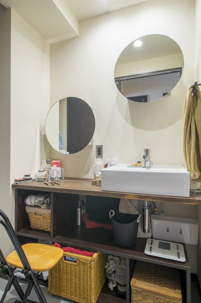 「いろいろな物件を見せていただいたおかげで、リノベーションの希望を出す時の参考になりました。ドアの色やアイアンラックの色も別の物件を見て、こんな感じがイイとお伝えしました。例えば、カウンターの下の木も他物件と一緒です。ただ、そこはランダムな組み方で、主張が強かったので、うちのは普通に組んでもらいました」(妻)と、すでにリノベーション済みの物件も参考にしていただけたと報告してくださいました。