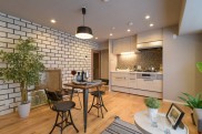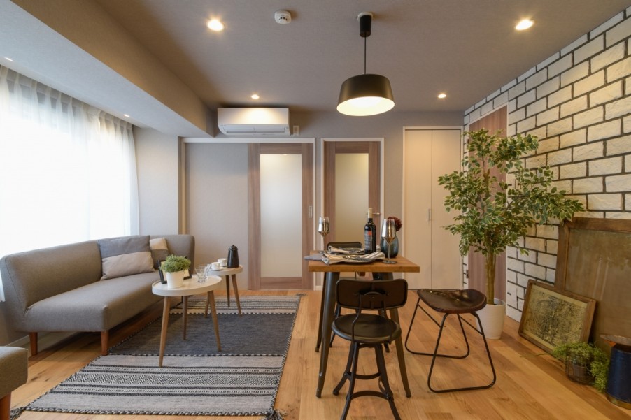 - 1ヨーロピアンな雰囲気を醸し出す白いレンガLDKの壁一面を白レンガで仕上げました。