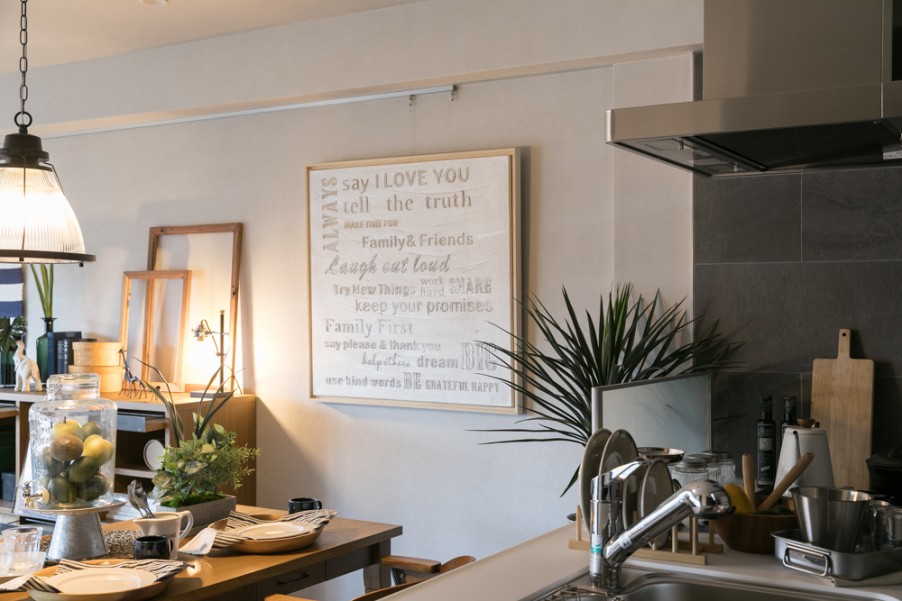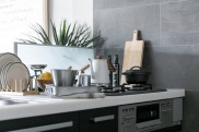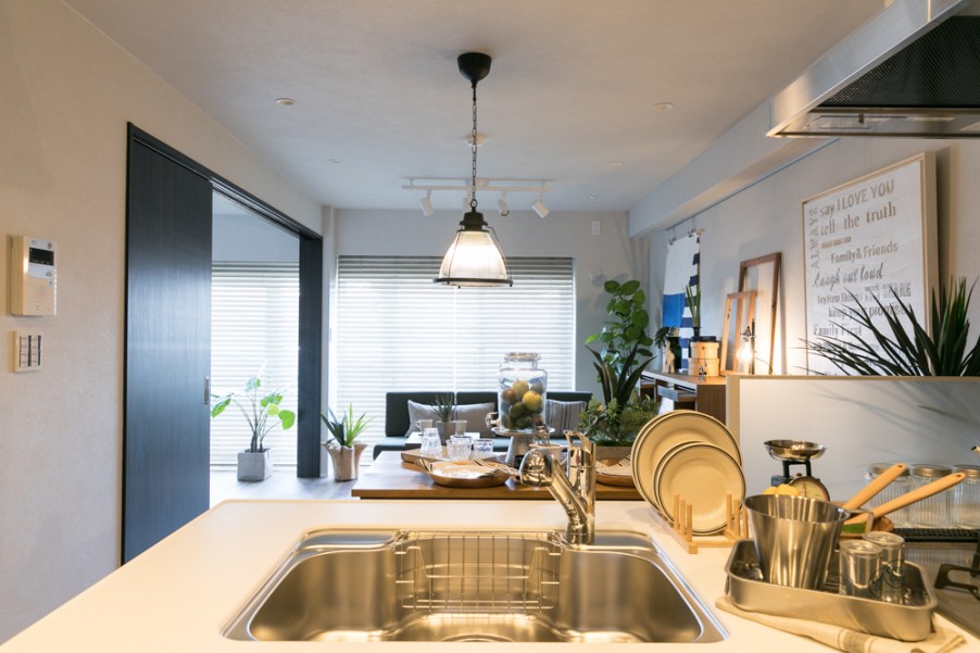 光が射してちょうど良くやわらかい空間になります。 - 3ワンポイントの壁面タイルが上品さを演出素材感のある壁面のタイルが上品なキッチン周り、キッチンパネルを使わずタイルにすることで高級感のあるお部屋に仕上げています。