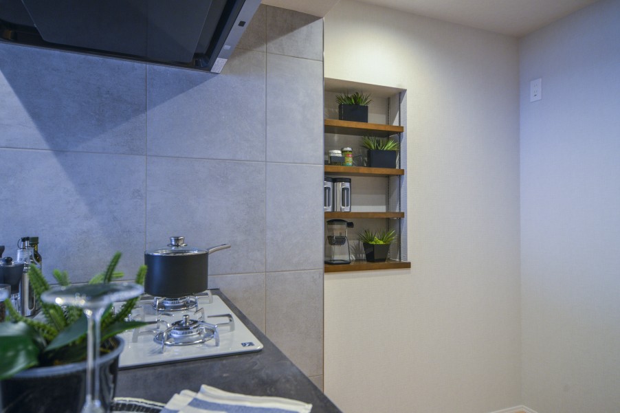 キッチンにはタイル調のパネルを施し高級感溢れる内装にしました。