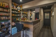 「お店ってオシャレじゃないですか? そんな雰囲気の中で、普段から生活がしたかったんです。本当に理想通りになりました。お気に入りポイントは全部ですが(笑) リビングと寝室の壁をグリーンで揃えたり、柱だけレンガを貼ってもらったり、壁の色にもこだわっています。それと天井を黒にしてもらったことで引き締まっていますよね。他にはあまりない色遣いだと思いますが、イメージ通りです。お気に入りのものを飾るのに、最適な造りになっています」 - 3リノベーション内容+立地の良さで生活機能面が大幅向上「本や小物が多いので、飾れるように棚をたくさん作ってもらいました。玄関を入って、すぐ左側に主人の作業スペースとしてDENを設けたのですが、ここもお気に入りです。設計の方がすごく親身になってくださって、キッチンにはパントリーがある方が便利ですよとか、棚はこんなものがグラスを飾ると映えますよなど、いろいろアドバイスしてくださいました。おかげで本当に暮らしやすいです」