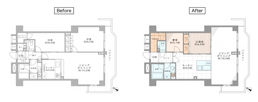従来の3LDKから1LDKへと間取りを一新したリノベーション事例です。小学生のお子様がいるファミリーでありながら、あえて個室は最小限に。バルコニーに面したリビングダイニングと和室をつなげて、家族が集まってゆったりと過ごせる広々としたLDKを創出しました。