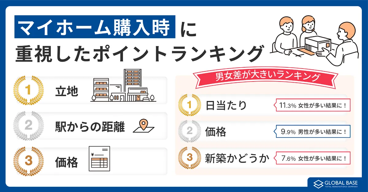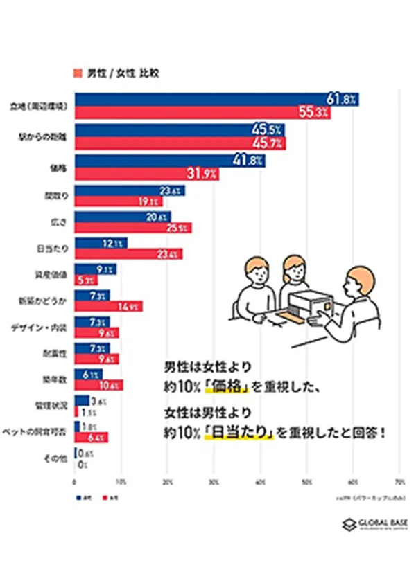 男性は女性より約10%多く「価格」を重視し、女性は男性より約10%多く「日当たり」を重視。