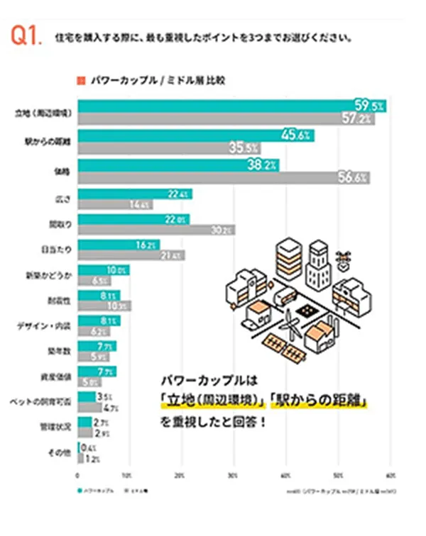 調査① 約60%のパワーカップルが住宅購入で「立地(周辺環境)」を最重視。