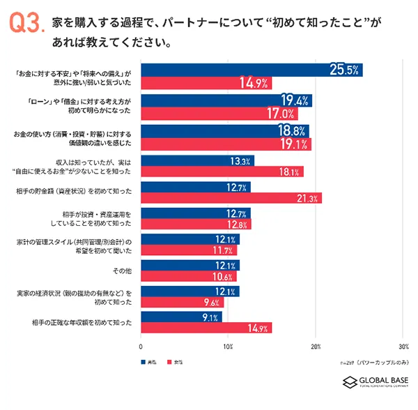 また、「家を購入する過程で、パートナーについて“初めて知ったこと”があれば教えてください」と訊いたところ、男性がパートナーに対して初めて知ったことは「お金に対する不安や将来への備えが意外に強い/弱いと気づいた」が1位となりました。また、女性がパートナーに対しては「相手の貯金額(資産状況)を初めて知った」が1位となりました。