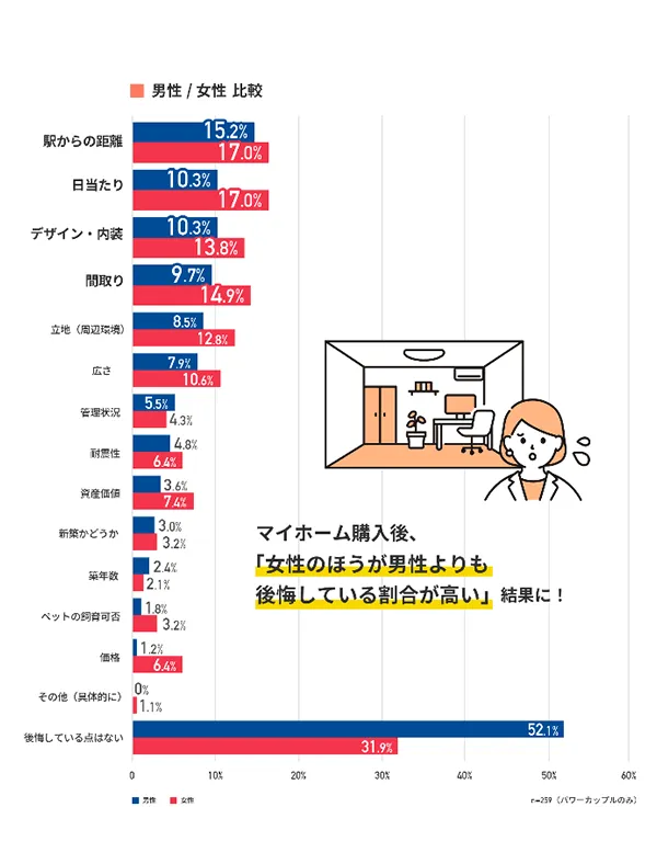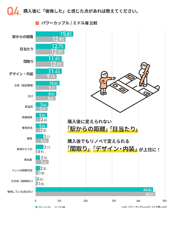 調査③ パワーカップルの住宅購入後の“後悔”、第1位は「駅からの距離」「日当たり」、