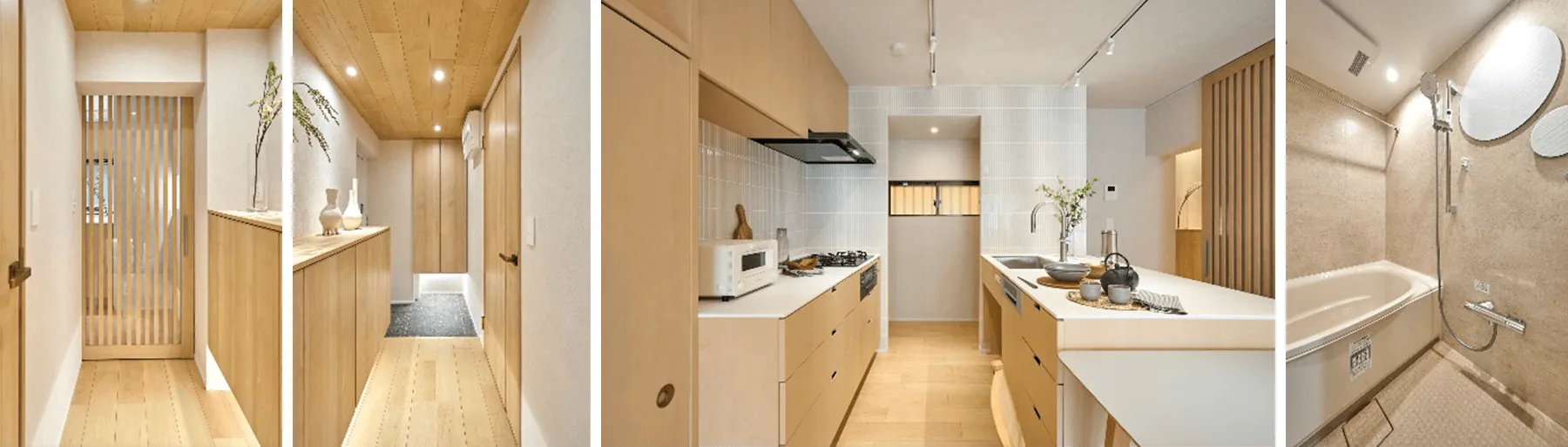 歴史と文化が息づく街・神楽坂に、和の趣と現代の快適性を融合させたリノベーションマンションが完成しました。神楽坂の石畳の路地や老舗料亭の風情を感じる街並みに調和するよう、自然素材や落ち着いた色調を取り入れた内装が特徴です。日本の伝統的な美意識を大切にしながら、最新設備や機能性を備えることで、都心にありながらも心安らぐ住まいを実現しています。● POINT 1 [和を感じる素材のぬくもりを、間接照明でさらに高める設計]