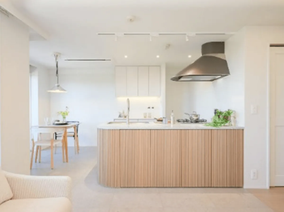 借景の緑を感じられるリビングになるよう、リビングと洋室を区切っていた壁を取り払い、ひとつなぎのLDKに間取り変更。もともと独立していたキッチンは、リビングダイニングを見渡すことができるオープンキッチンに変更し、前面はリブ材と曲線が美しいデザインに。