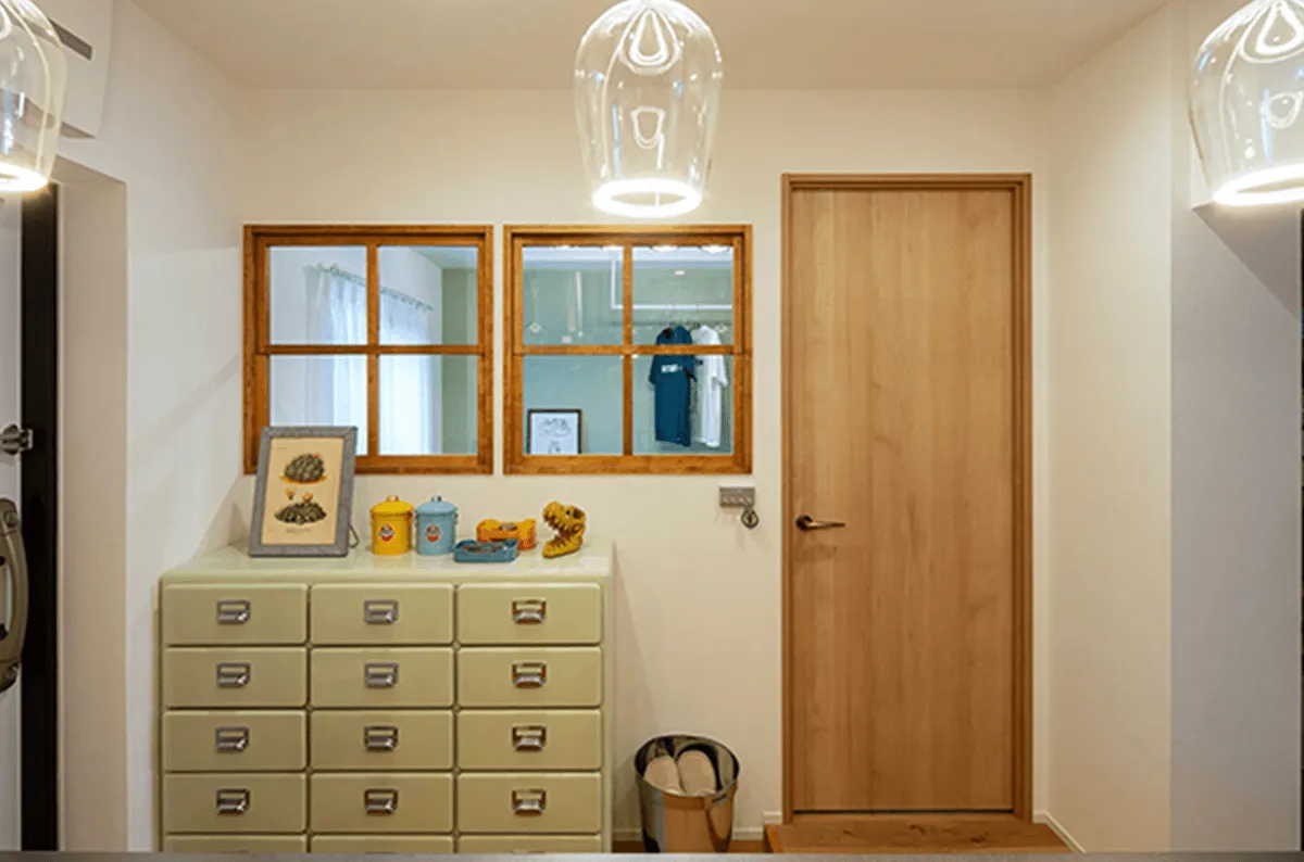ウッドの室内窓が柔らかく光を通し、⽞関と洋室をゆるやかに繋ぎます。アールの効いたアイボリーのスチールドロワーを靴箱として活⽤。天板には、雑貨やアートを気ままにディスプレイし、「迎える場所」として楽しみます。⾒せる楽しさと隠す安⼼感を両⽴しながら、暮らしの始まりと終わりを軽やかに彩ります。
