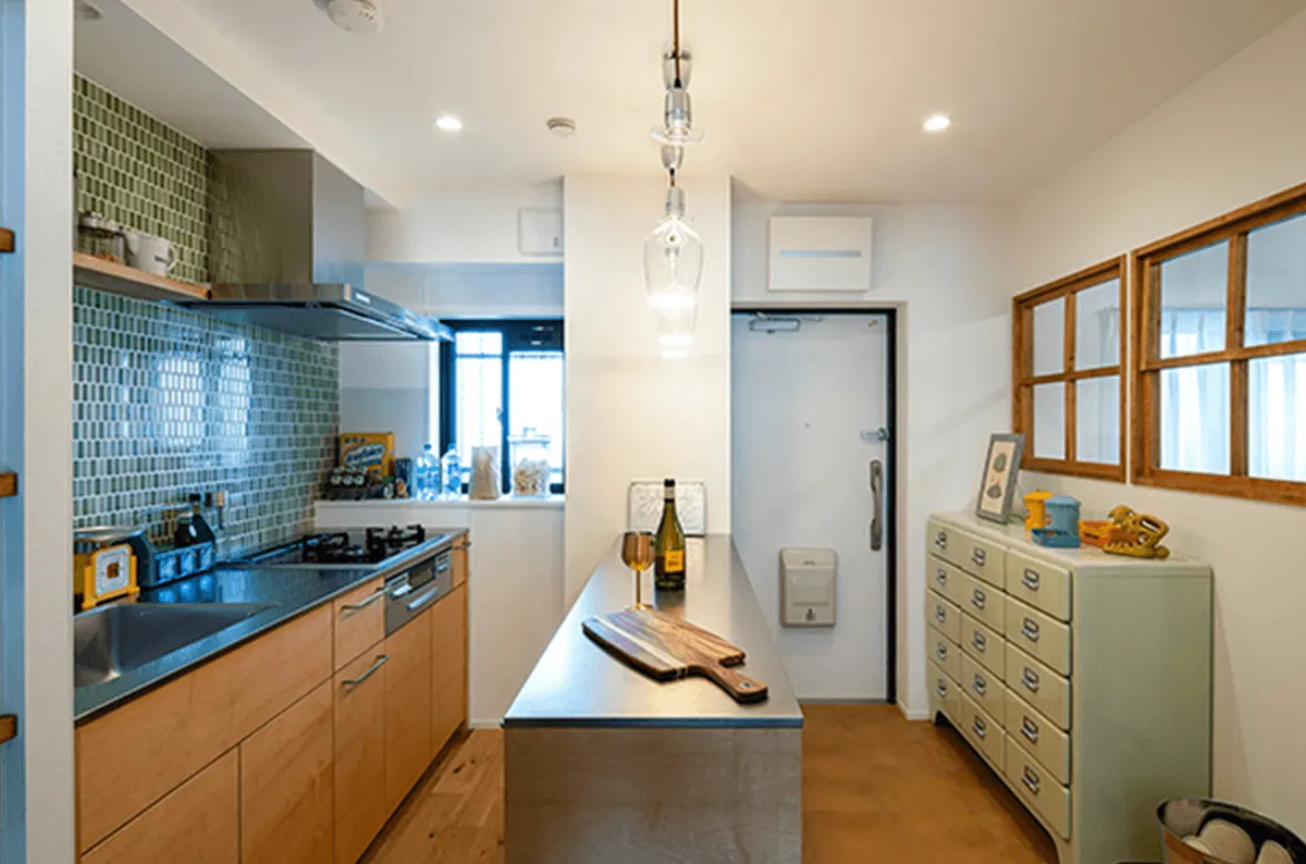 玄関からつながる開放的な空間に、ウッドとグリーンのタイルが軽やかなアクセントに。タイルの貼り⽅や余⽩の取り⽅にもこだわり、空間全体を整えつつ、⼼地よいリズムを作りました。