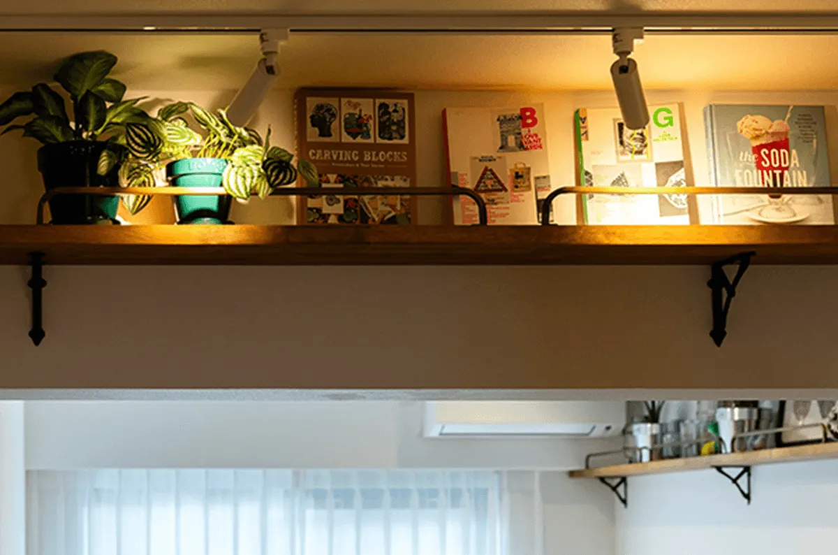 ダルトンアイテムで造作したウォールシェルフには、本やグリーンを飾ると、程よくラフで親しみやすい雰囲気になります。