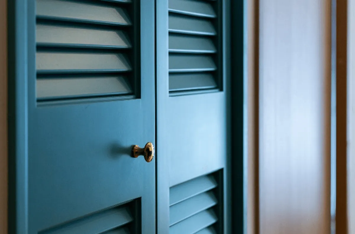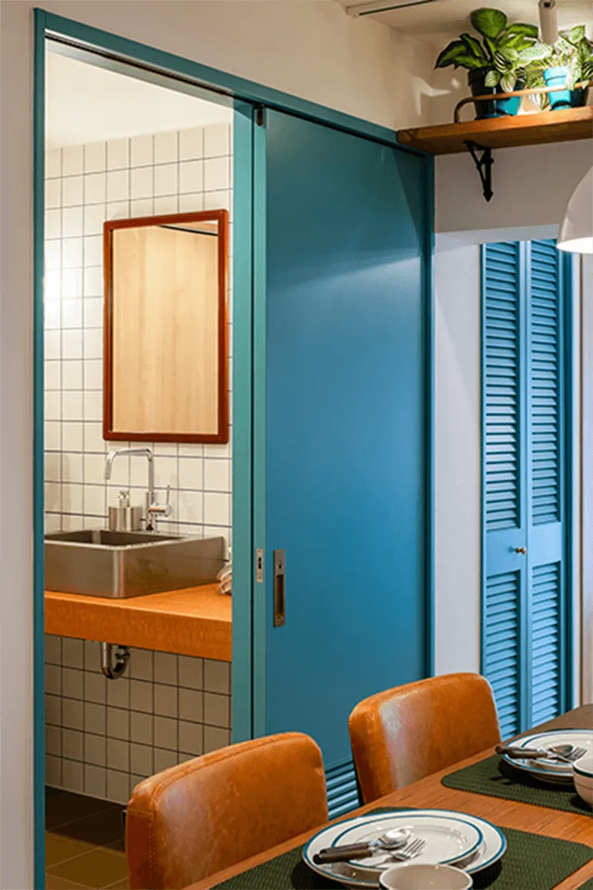 ブルーのベルベットソファに⾝をゆだね、プロジェクターで映画を楽しむ̶̶そんな穏やかな休⽇のひとときを過ごせます。太いラインで表現された⽂字盤が印象的な両⾯時計は、インテリアに雑貨のようなアクセントを添えます。リビング収納にはルーバーのクローゼットドアを採⽤。ルーバーと、グレイグリーンのカラーが軽やかで⼼地よい印象を与えます。