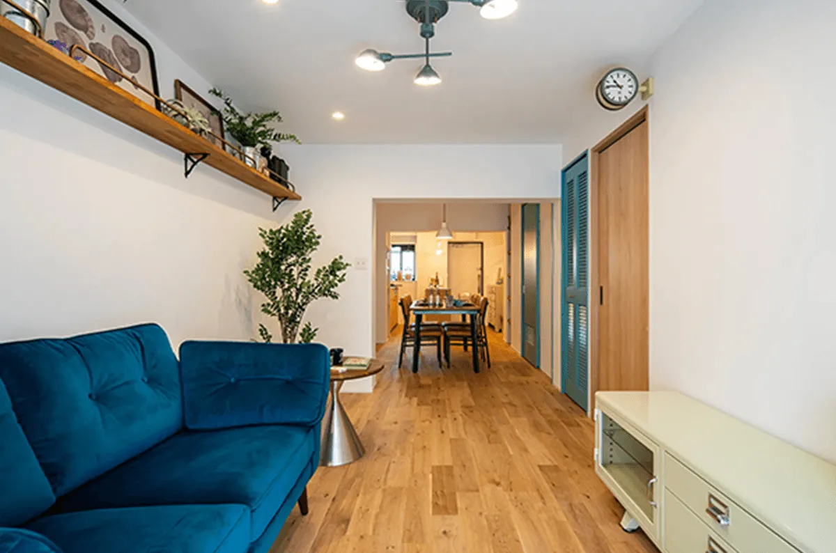 ふとした瞬間も絵になるような、ダルトンホームらしいリノベーションです。⽩を基調とした明るい空間に、ウッドの温もりとアイボリーの柔らかさが調和します。ブルーのアクセントカラーや雑貨で遊び⼼を添えながらも、全体は統⼀感のあるテイストに。
