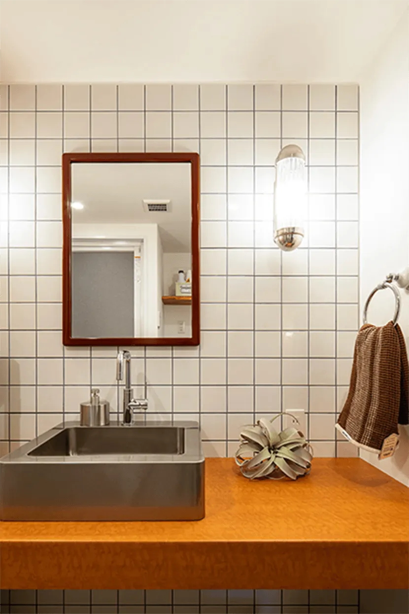 温かみのあるブリックブラウンのミラーと、ガラスのラインが印象的なウォールランプ、ネイビーのタイル⽬地が、海外のバスルームのような雰囲気に。広々としたカウンターは2⼈でも快適に使⽤でき、忙しい朝もスムーズです。ここにもグレイグリーンのダルトンホームのオリジナル建具を採⽤し、空間に個性をプラス。
