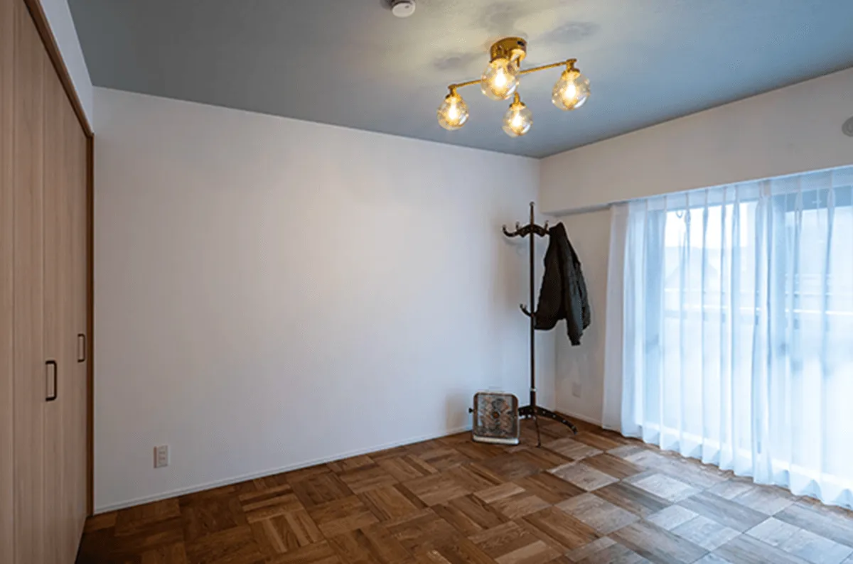 寝室は天井の淡いブルーグレーのアクセントクロスが空間に程よい温もりを添えます。天井にアクセントカラーを加えることで、空間に奥⾏きが⽣まれ、1⽇の終わりにほっと⼼が休まる雰囲気に。