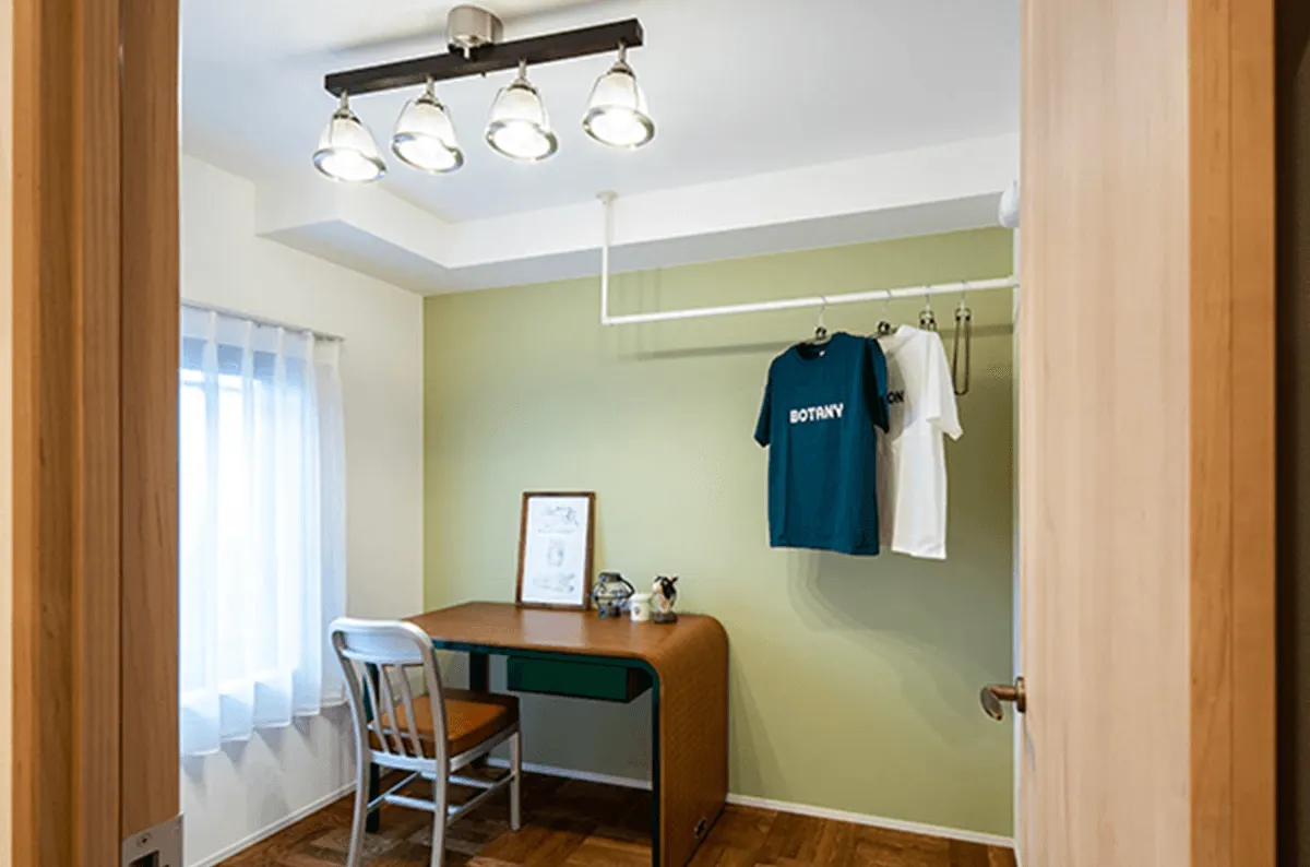 洋室は⽞関の室内窓越しに差し込むやさしい光が奥⾏きと繋がりを感じさせます。デスクはダイニングと同じダルトンの家具で統⼀感を持たせ、働く時間もくつろぐ時間も⾃分らしく楽しめる空間に仕上げました。