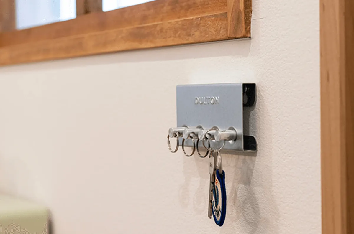 本物件では家具や雑貨を選ぶように、建材や小物によって遊び⼼あふれる空間をつくります。ダルトンのキーストレージや棚板に施したバー・ブラケット・ペーパーホルダーなど、細部にまで遊び⼼を取り⼊れることで、⽇々の暮らしにちょっとした楽しさをプラスします。