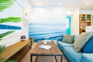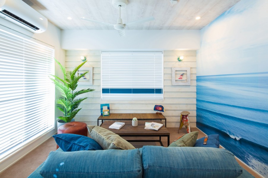 当事例では、海のグラフィックを取り入れ、カリフォルニアらしいインパクトのあるリビングに仕上げています。