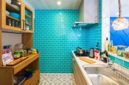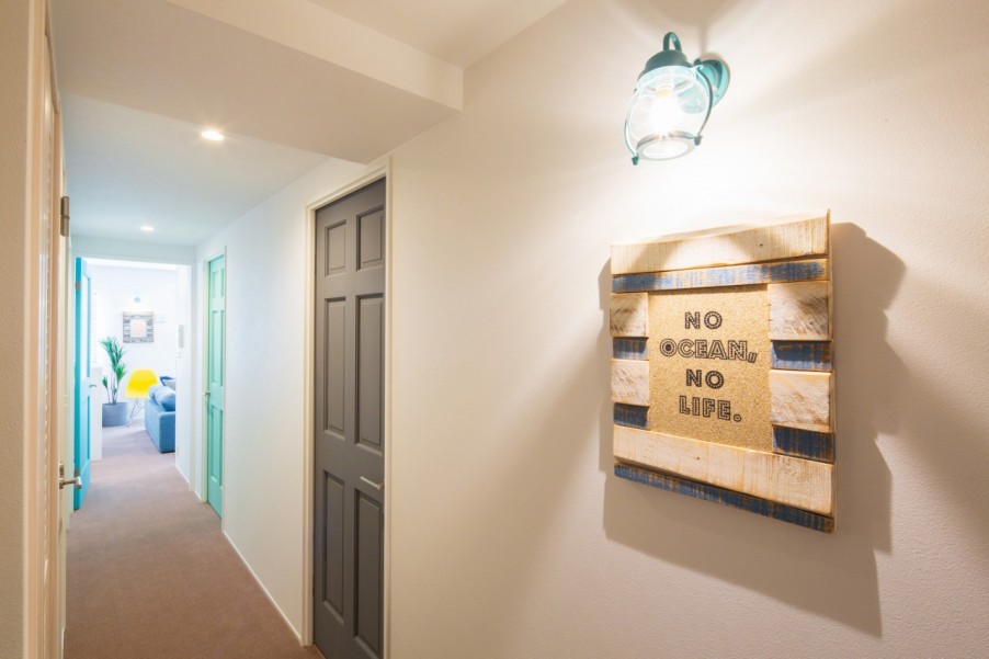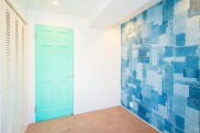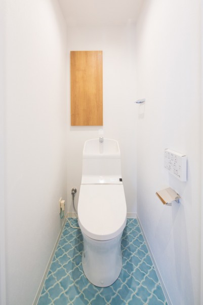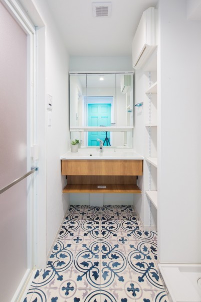 カリフォルニアスタイルリビングダイニングやキッチンのほか、洗面室の柄タイルや洋室のドアなど、リゾート感のあるブルーを使用し空間に一体感を作っています。