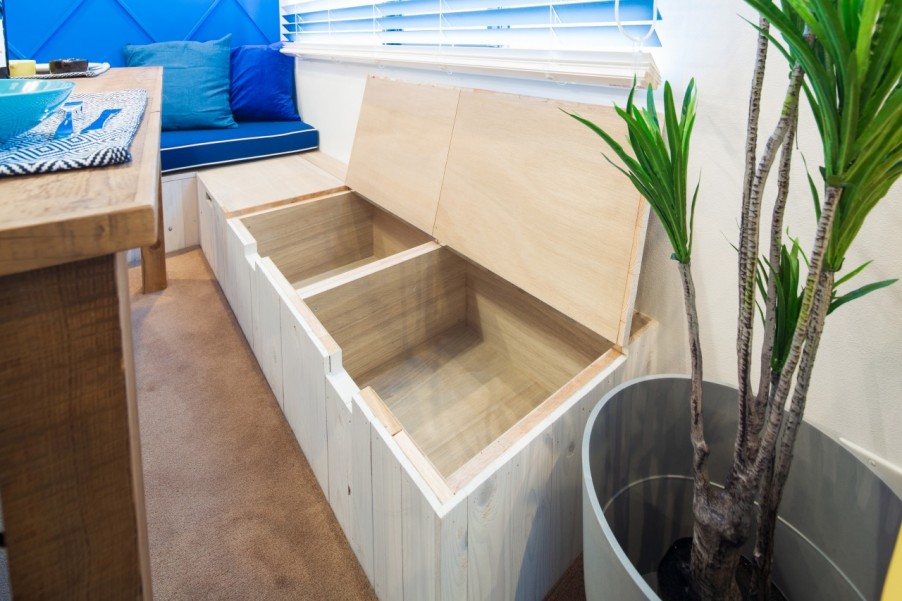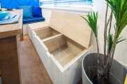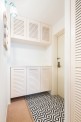白い収納の扉にはルーバーを設け、リゾート感を出すとともに、空気の換気をする機能も担います。