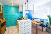 キッチンの白い穴あきブロックは、カリフォルニアでも注目を集める人気の素材。キッチンの壁に使ったのは当事例が初めての試みとなります。