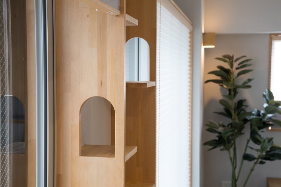 「日々のなかで、ディオと密なコミュニケーションがとれるようになったと感じています。たとえば、キッチンから部屋を見渡しやすいのでどこにいるか把握しやすいんです。たぶん、ディオもわたしの気配が感じやすくなったんじゃないかと思います(笑)。いつも安心できるんですよね。キャットウォーク以外にも、キャットルーフ、キャットステップがたくさんついているおかげで、ディオの居場所が増えました。たとえばキッチンで料理していると、いつのまにか目線があうリビングの止まり木に来ていることが多かったり」